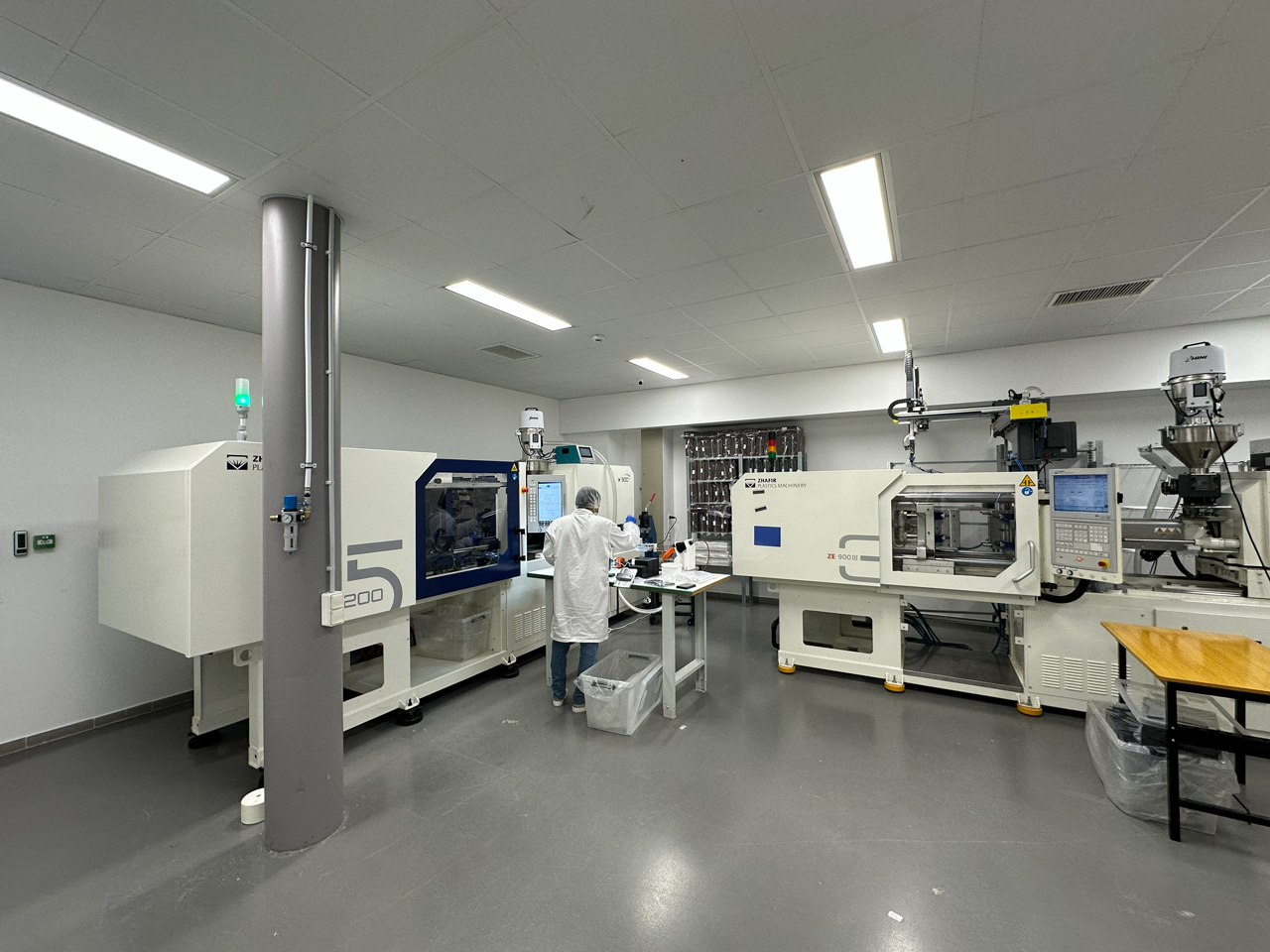 A tisztateres fröccsöntést ISO 8 minősítésű tisztatérben végezzük, ami biztosítja a por és szennyeződés-mentes gyártást. A tisztatérben kettő új generációs hibrid hajtású Haitian Zhafir fröccsgéppel dolgozunk. Ezek minden tekintetben megfelelnek a szigorú tisztateres követelményeknek